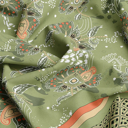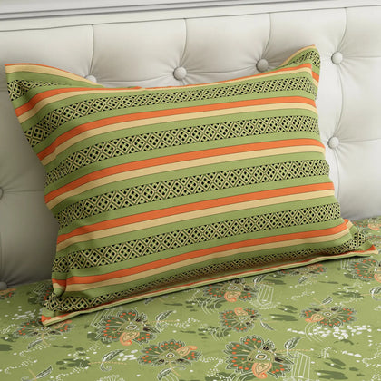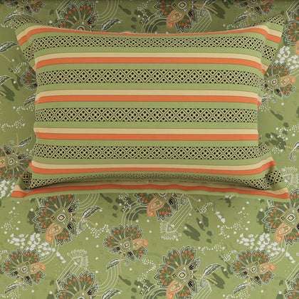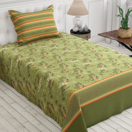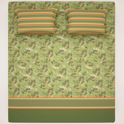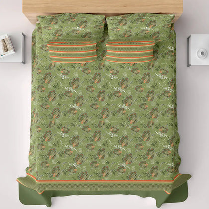 This beautiful bedsheet set that brings a fresh, garden look to your room.The main part of the bed sheet has a natural green color covered with a delicate, lighter floral or vine pattern. This main section is framed by a bold, wide border at the foot of the bed that is solid leaf green and trimmed with a bright orange or burnt sienna color. The border gives the set a sharp, finished, and layered appearance.Crafted from premium cotton blended, this bedsheet offers a -smooth texture and a subtle sheen that enhances the elegance of your space.