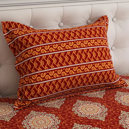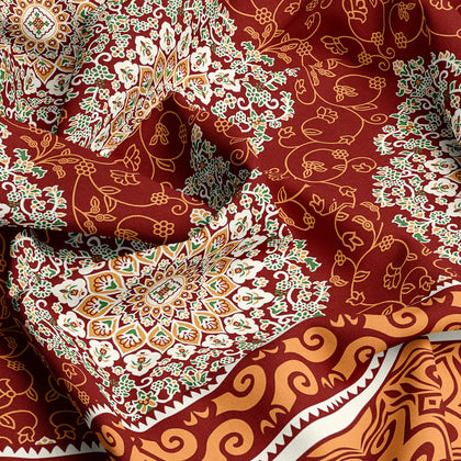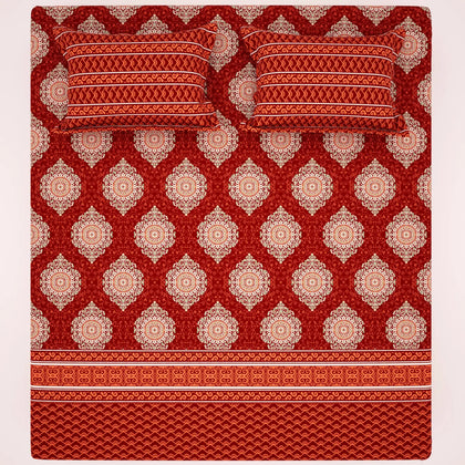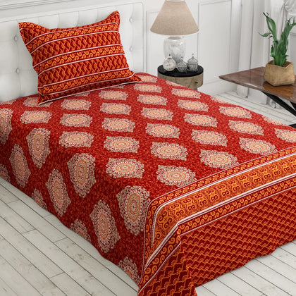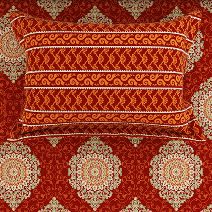 Experience the perfect blend of style with our Terracotta Medallion Fitted Sheet.This sheet features a striking, global-inspired medallion pattern (Jaal) in a warm, sophisticated terracotta orange hue, complemented by lighter neutral accents..Crafted from a soft and durable Cotton Blended fabric, this sheet provides the best of both worlds the natural breathability and comfort of cotton.