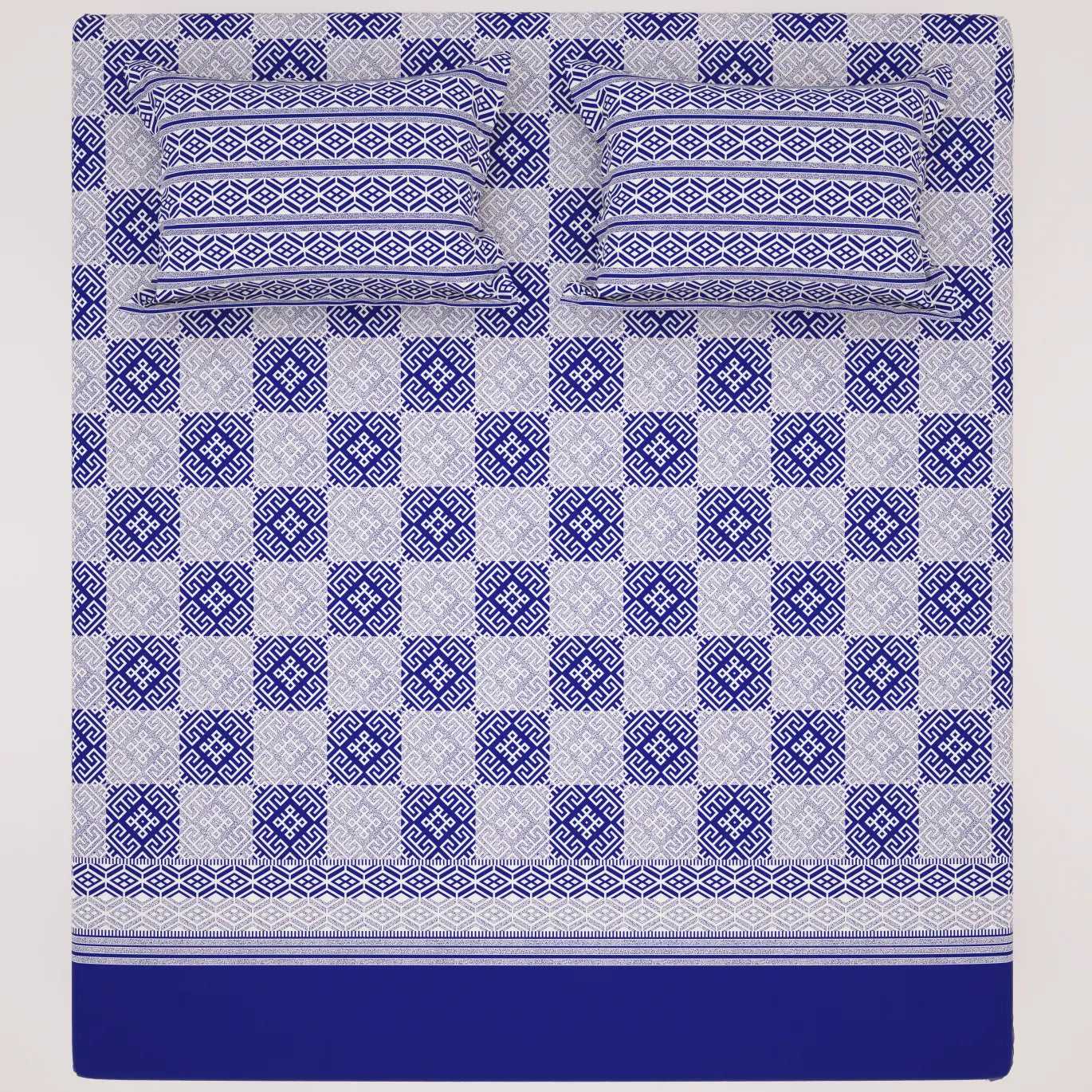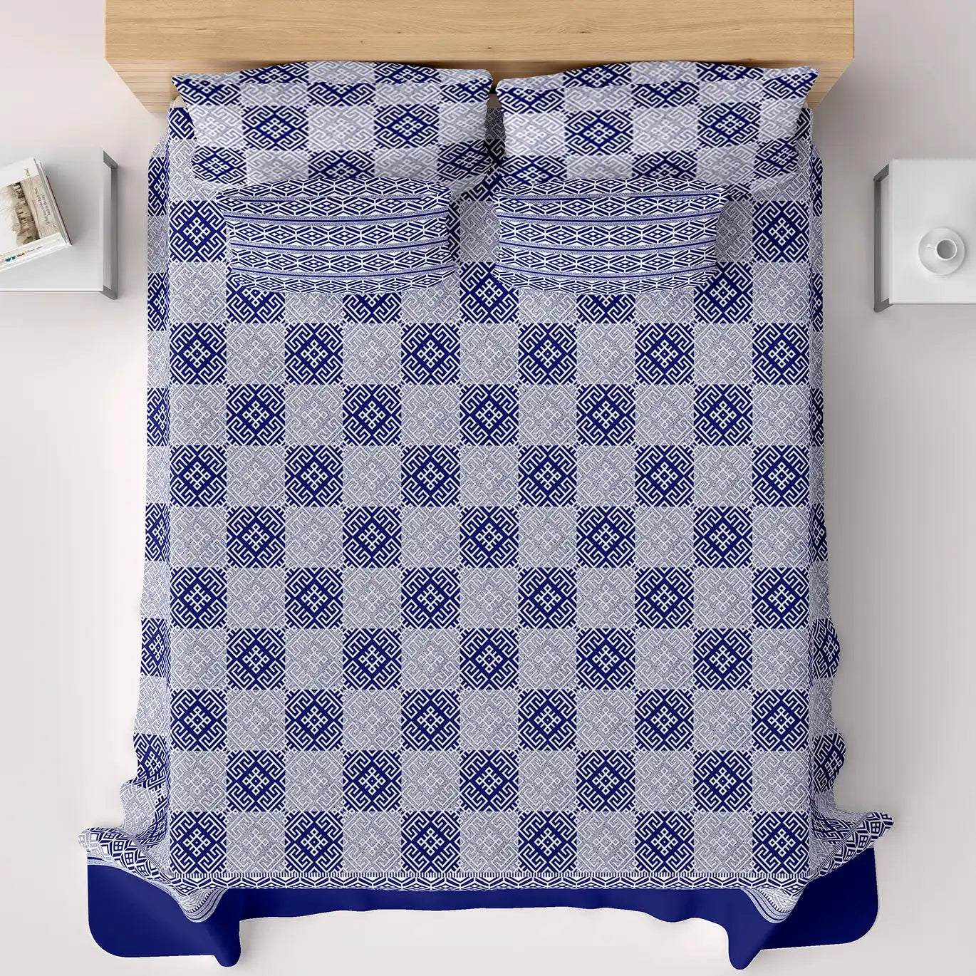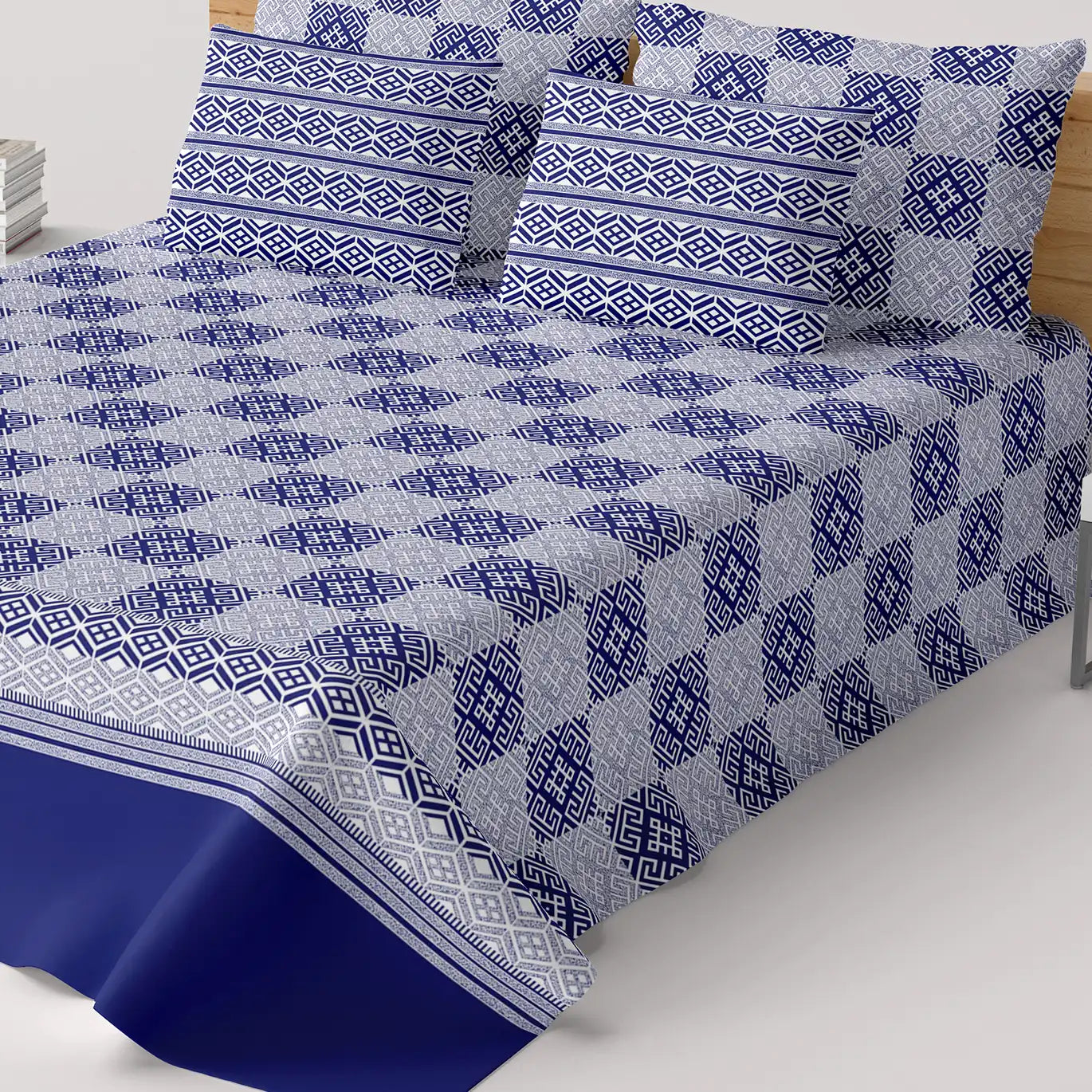 Bring a wave of calm and serenity to your bedroom with this Cool Blue Bedsheet Set.This set features a beautiful, intricate geometric pattern that combines shades of bright white.The design has a classic, almost hand-stamped or block-printed look, giving it an artisanal feel. The main area of the sheet is covered in a delicate diamond and floral mosaic, which is perfectly framed by a simple, elegant border.Crafted from a premium cotton-blended fabric, this bedsheet offers the perfect blend of softness, breathability, and durability.