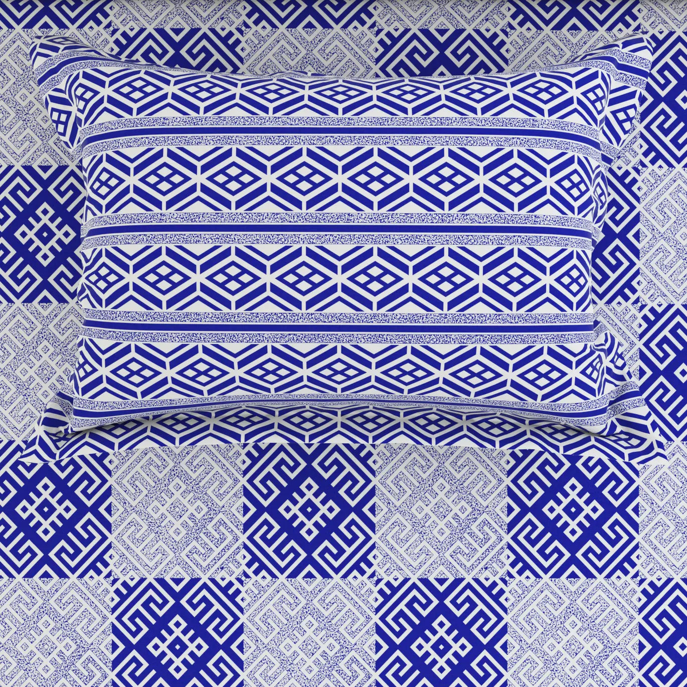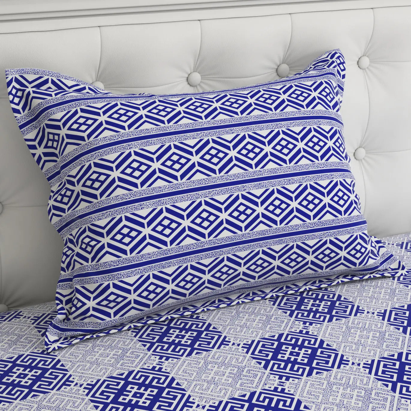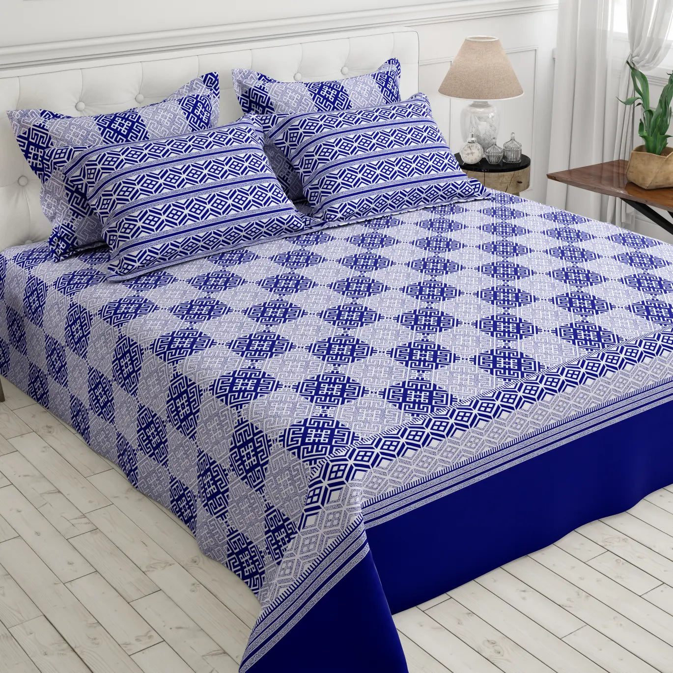 Bring a wave of calm and serenity to your bedroom with this Cool Blue Bedsheet Set.This set features a beautiful, intricate geometric pattern that combines shades of bright white.The design has a classic, almost hand-stamped or block-printed look, giving it an artisanal feel. The main area of the sheet is covered in a delicate diamond and floral mosaic, which is perfectly framed by a simple, elegant border.Crafted from a premium cotton-blended fabric, this bedsheet offers the perfect blend of softness, breathability, and durability.