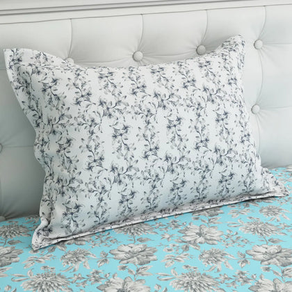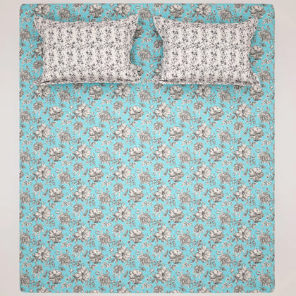 This lovely bed sheet set, which we can call the "Teal Roses" design, features a delicate, vintage-inspired pattern.The main color of the sheet is a soothing, muted aqua or dusty teal, which provides a calm and serene base. Scattered across this background is a classic floral print, primarily featuring small, detailed roses and leaves in soft colors like gray, white, and dusty green.The overall look is charming, soft, and subtle, perfect for creating a relaxed and inviting atmosphere in the bedroom.