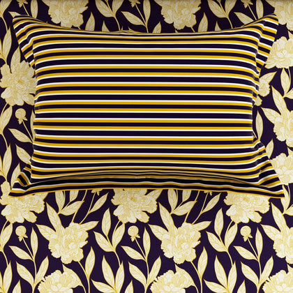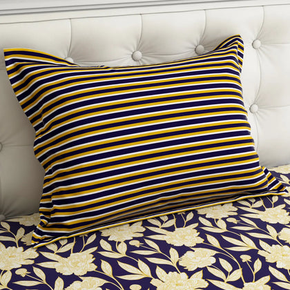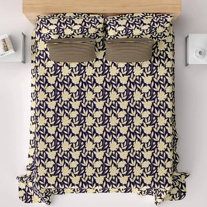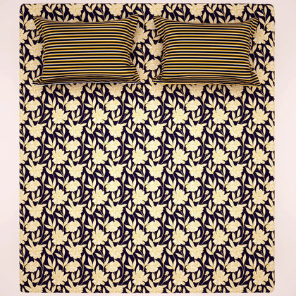 Experience the elegance of timeless style with the Royal Dusk Bed Sheet Set. Crafted from a soft and durable cotton blend, this bedsheet offers the perfect balance of comfort, breathability, and easy care. The design features an intricate floral pattern set against a rich midnight blue base, beautifully highlighted with golden-beige motifs.The subtle contrast of dark and light tones adds depth and charm, making it an ideal choice for both modern and traditional interiors.