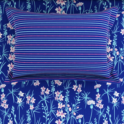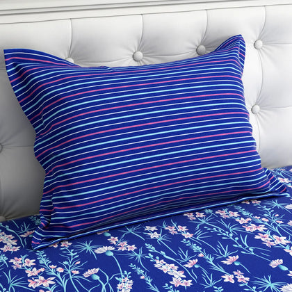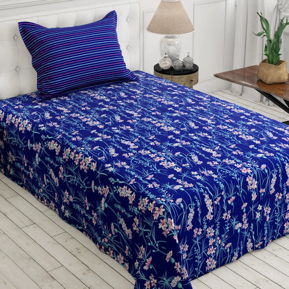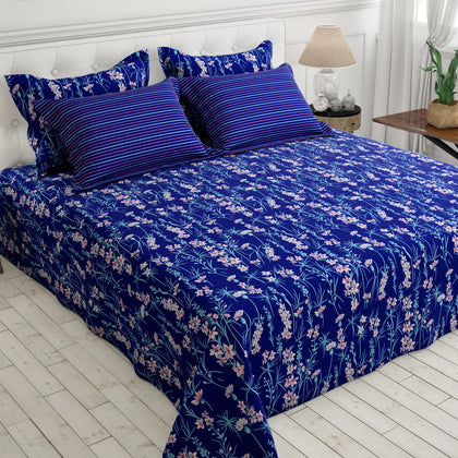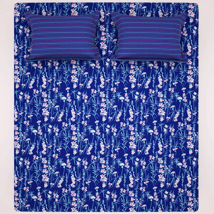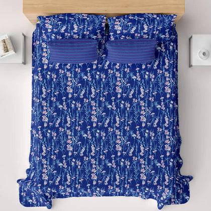 Bring the dramatic beauty of a midnight garden into your bedroom with the Deep Petals Bedsheet Set. This striking ensemble features a luxurious, deep Navy Blue or Indigo background that sets the stage for a charming, all-over pattern of delicate floral vines and scattered petals in soft pinks and whites.This mix of a soft floral print on the sheet and a sharp geometric stripe on the pillows provides dynamic visual interest.Crafted from luxurious Cotton Blended fabric,Perfect for creating a calm and restful retreat, this set is ideal for a spring refresh or year-round peaceful sleeping.