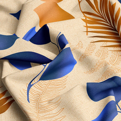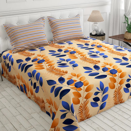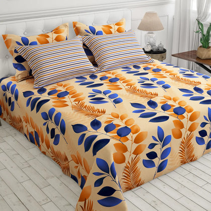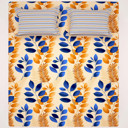 This inviting bed sheet set features a striking tropical leaf print that effortlessly blends warmth and vibrant design into your bedroom decor.The design showcases large, stylized leaves in rich indigo blue and deep autumn orange/rust, dynamically set against a soft, calming beige base. This color combination provides a beautiful balance, making the bedding a versatile centerpiece for various room styles.Crafted from a premium cotton blend, this bedsheet offers the perfect mix of softness, durability, and easy maintenance.