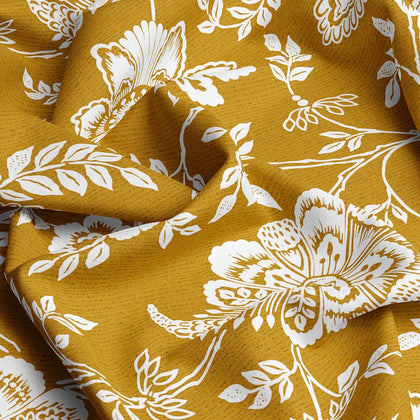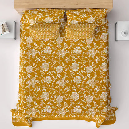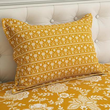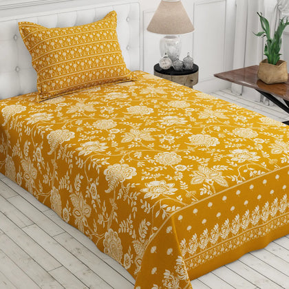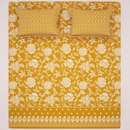 This inviting bed sheet set features a vibrant mustard yellow color and a beautiful traditional print, perfect for bringing a cheerful and warm look to your bedroom.The sheet is made from a cotton-blended material. This choice of fabric offers the best of softness and breathability with the durability and easy maintenance.The design showcases a detailed, tonal floral and medallion pattern across the sheet in a slightly lighter shade of yellow/white. A bold border featuring a distinct geometric pattern runs along the edges, adding a classic, handcrafted touch.