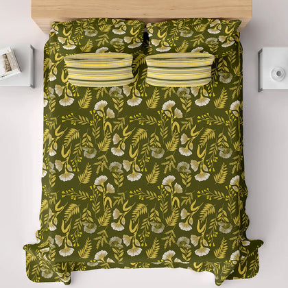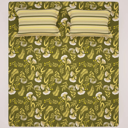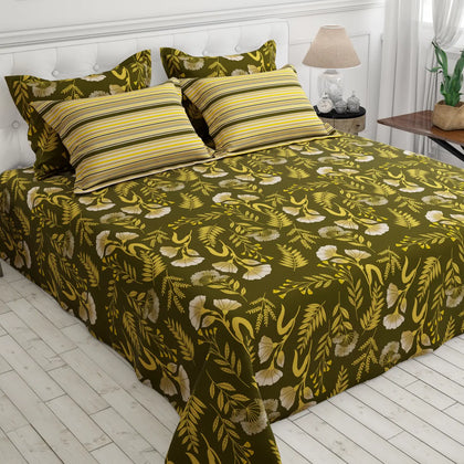 Bring nature’s calm into your bedroom with the Leaf Harmony Bed Sheet Set. Crafted from a soft cotton blend, this bedsheet offers the perfect balance of comfort, breathability, and easy maintenance. The elegant leafy pattern in soothing olive and golden tones adds a touch of natural charm to your décor, creating a refreshing and cozy ambiance.