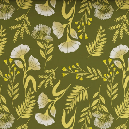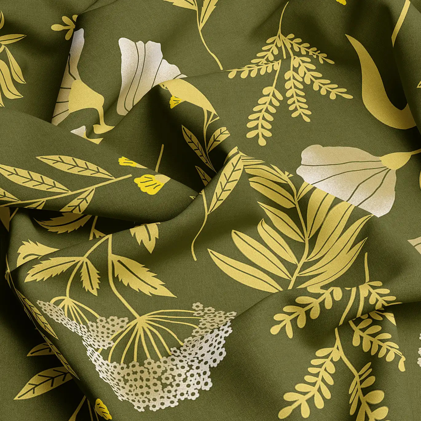Colour: Olive green base adorned with elegant golden-yellow and beige leaf motifs.
