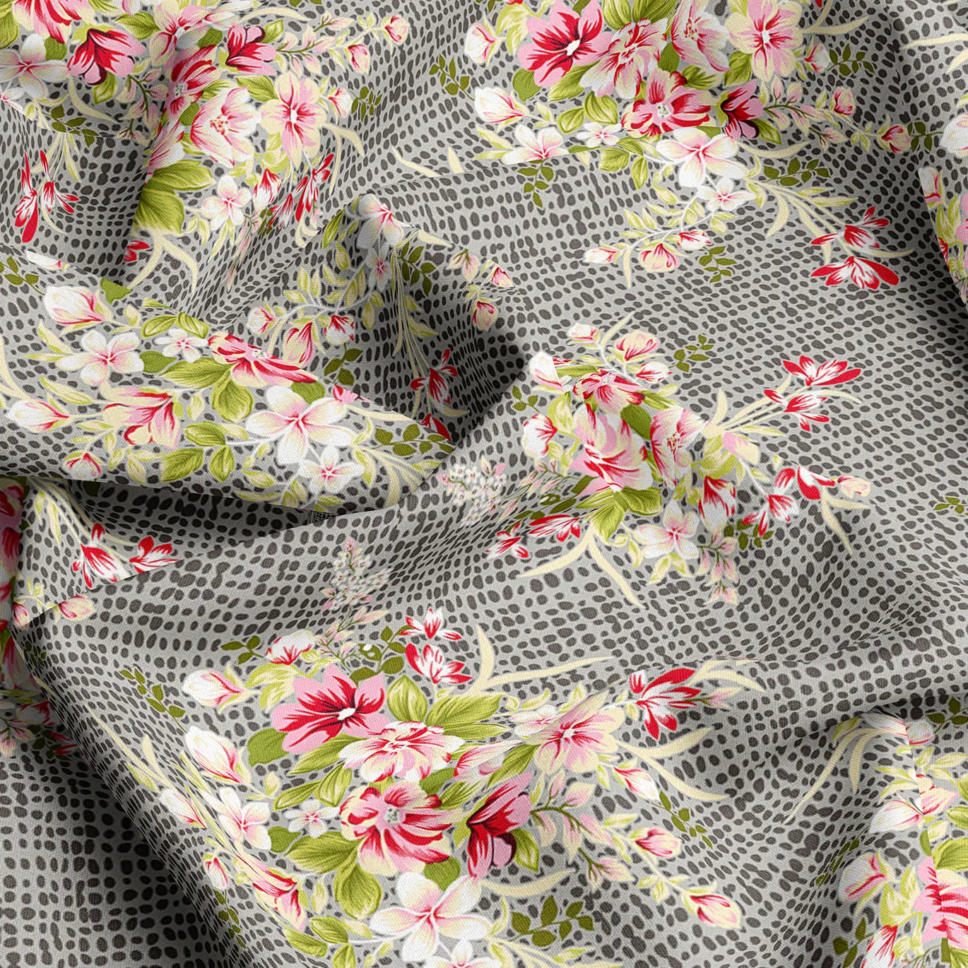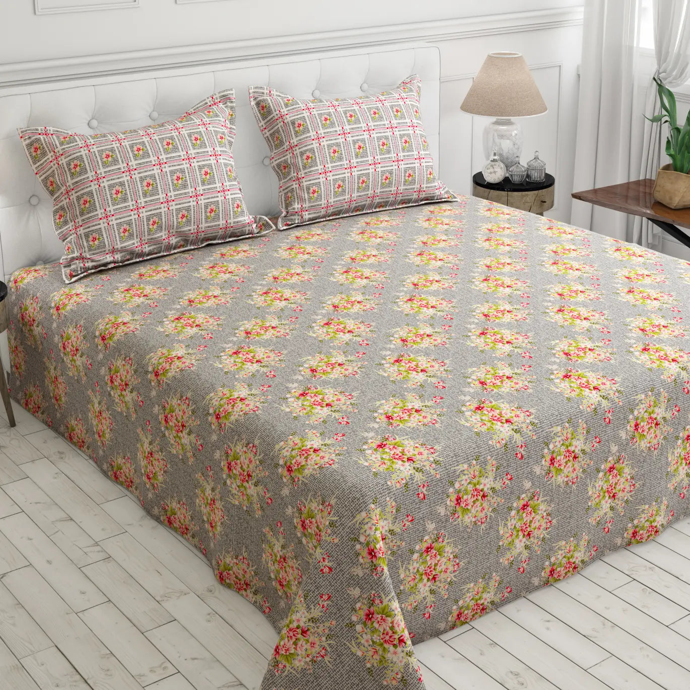 This beautiful bed sheet set, titled "Pastel Gray," features a charming, vintage-inspired look perfect for creating a soft and tranquil bedroom setting.The main sheet has a muted gray base, giving it a sophisticated, subdued foundation. Scattered across this gray are numerous small, clustered floral prints in warm, gentle colors like pinks, reds, and soft yellows, reminiscent of a classic rose garden.The sheet is made from a cotton-blended material. This choice of fabric offers the best of softness and breathability with the durability and easy maintenance.