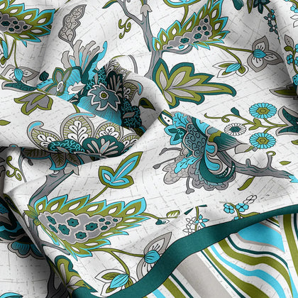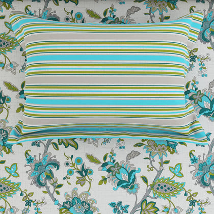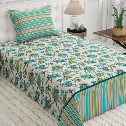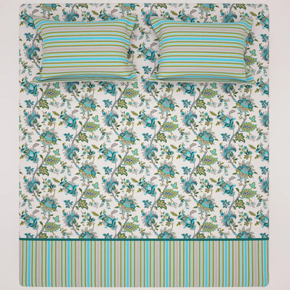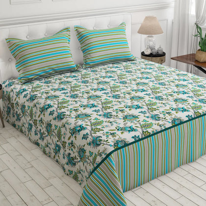 Add a touch of freshness to your bedroom with this beautifully designed.The elegant floral print in shades of teal, green, and white perfectly complements the striped border and pillow covers, giving your space a modern yet soothing look. Made from a soft and durable cotton blend, it ensures comfort, easy maintenance, and long-lasting colour vibrancy.