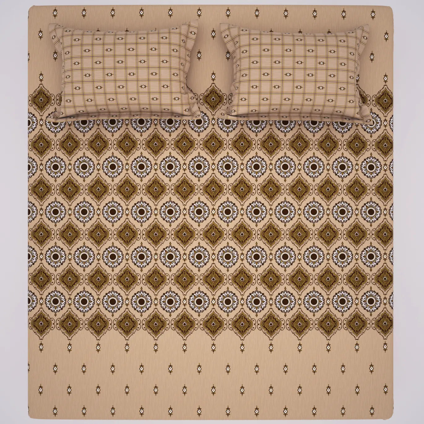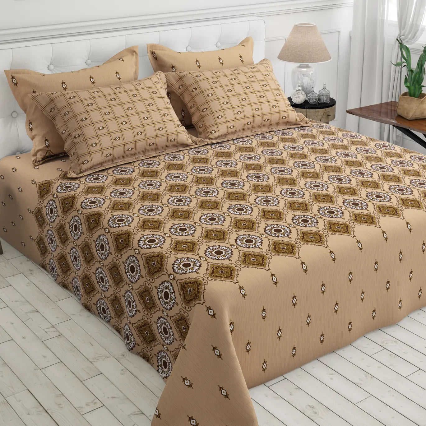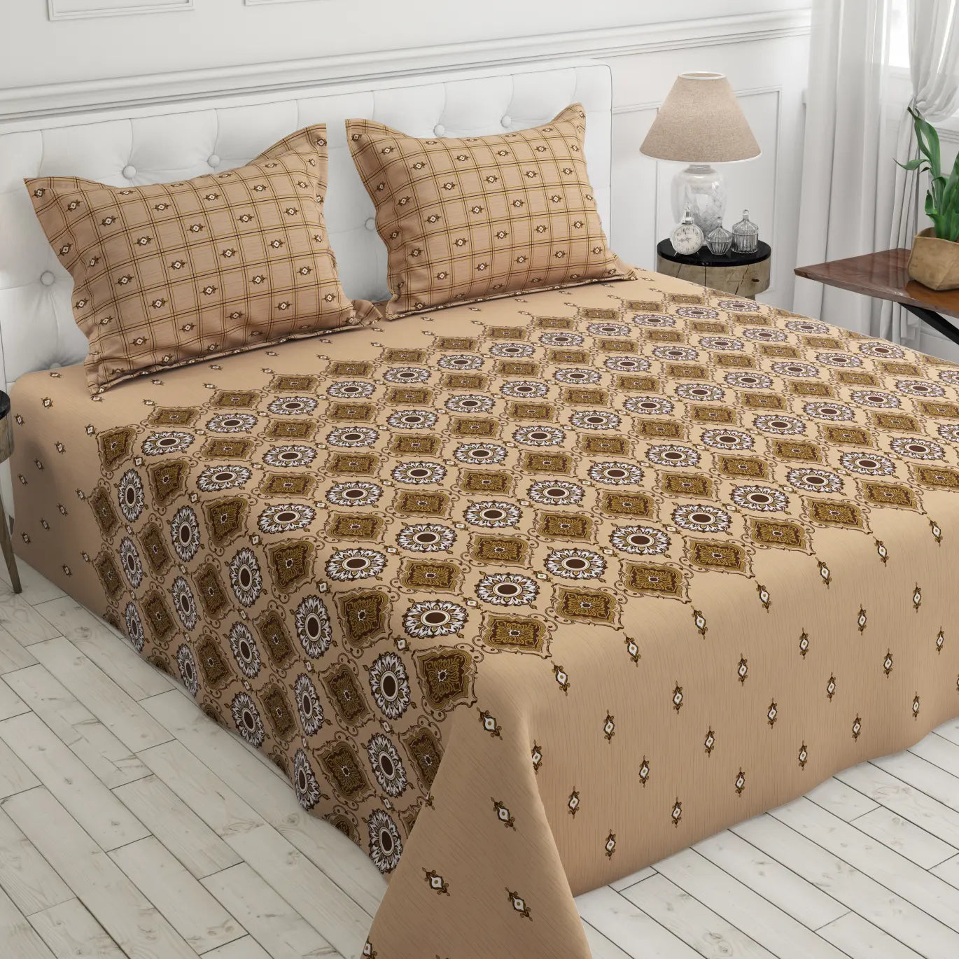 Bring warmth and sophistication to your bedroom with this beautifully designed cotton blended bedsheet. Featuring an elegant geometric and traditional block pattern in rich shades of beige, brown, and gold, it adds a touch of timeless charm to any space. Crafted from soft and durable cotton blend fabric, this bedsheet ensures comfort, easy care, and long-lasting colour and texture. Perfect for daily use or to give your bedroom a stylish refresh.