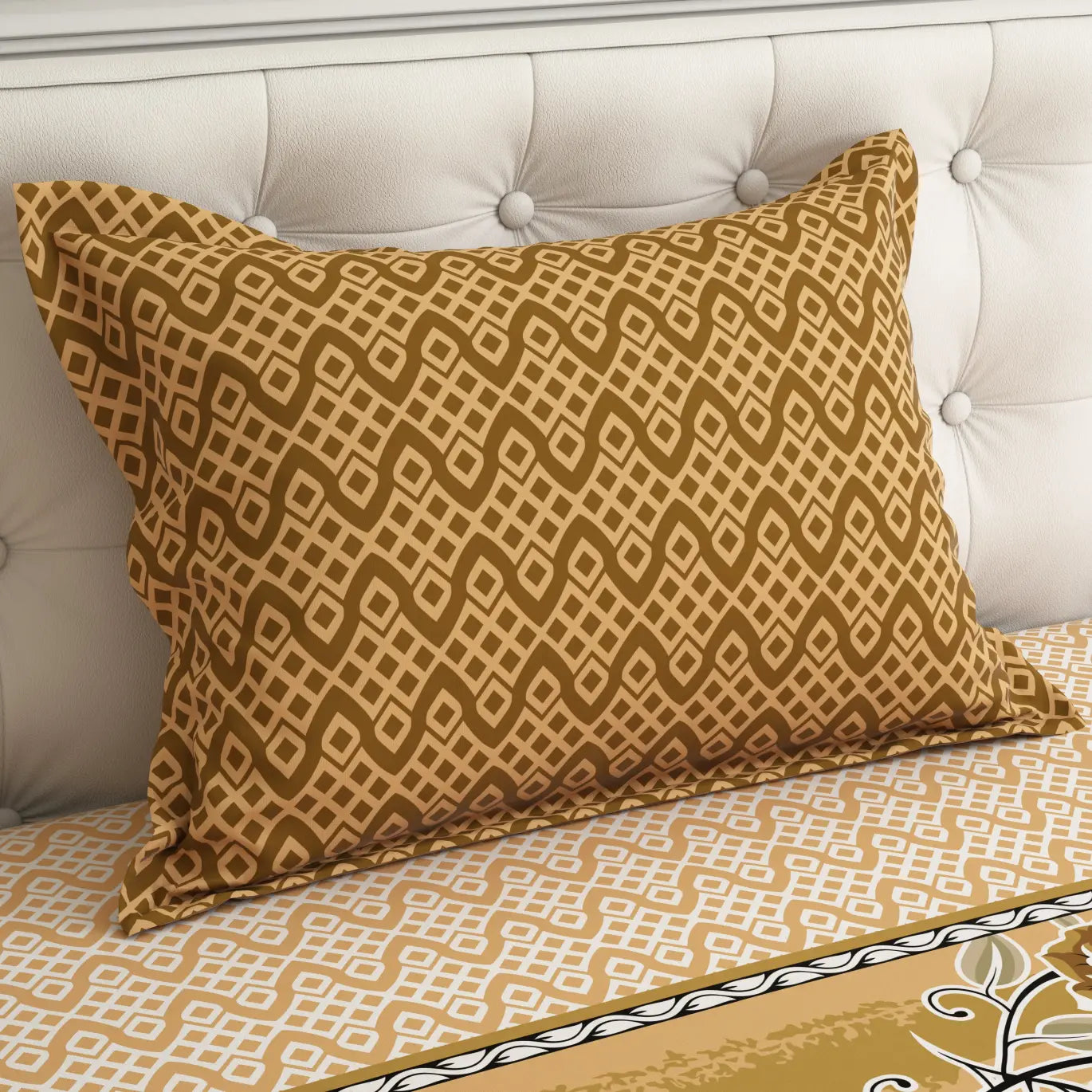 Transform your bedroom with the Xara Brown Golden Floral Bed Sheet Set. Featuring an elegant floral design paired with a chic geometric border, this set adds a touch of sophistication to any space. The stylish zigzag pillows complete the look, offering both comfort and flair. Made from soft and durable cotton blended fabric, it promises a cozy night's sleep while enhancing your decor. Elevate your bedding collection with this stunning set today.