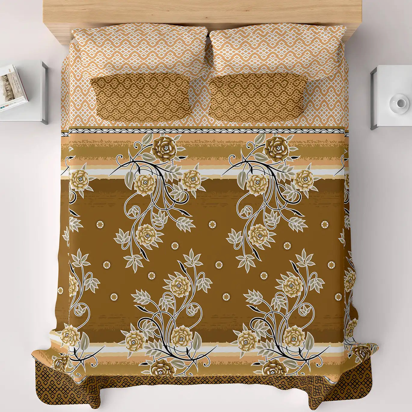 Xara Brown Golden Floral Bed Sheet Set with Geometric Border and Zigzag Pillows - 8058-8059