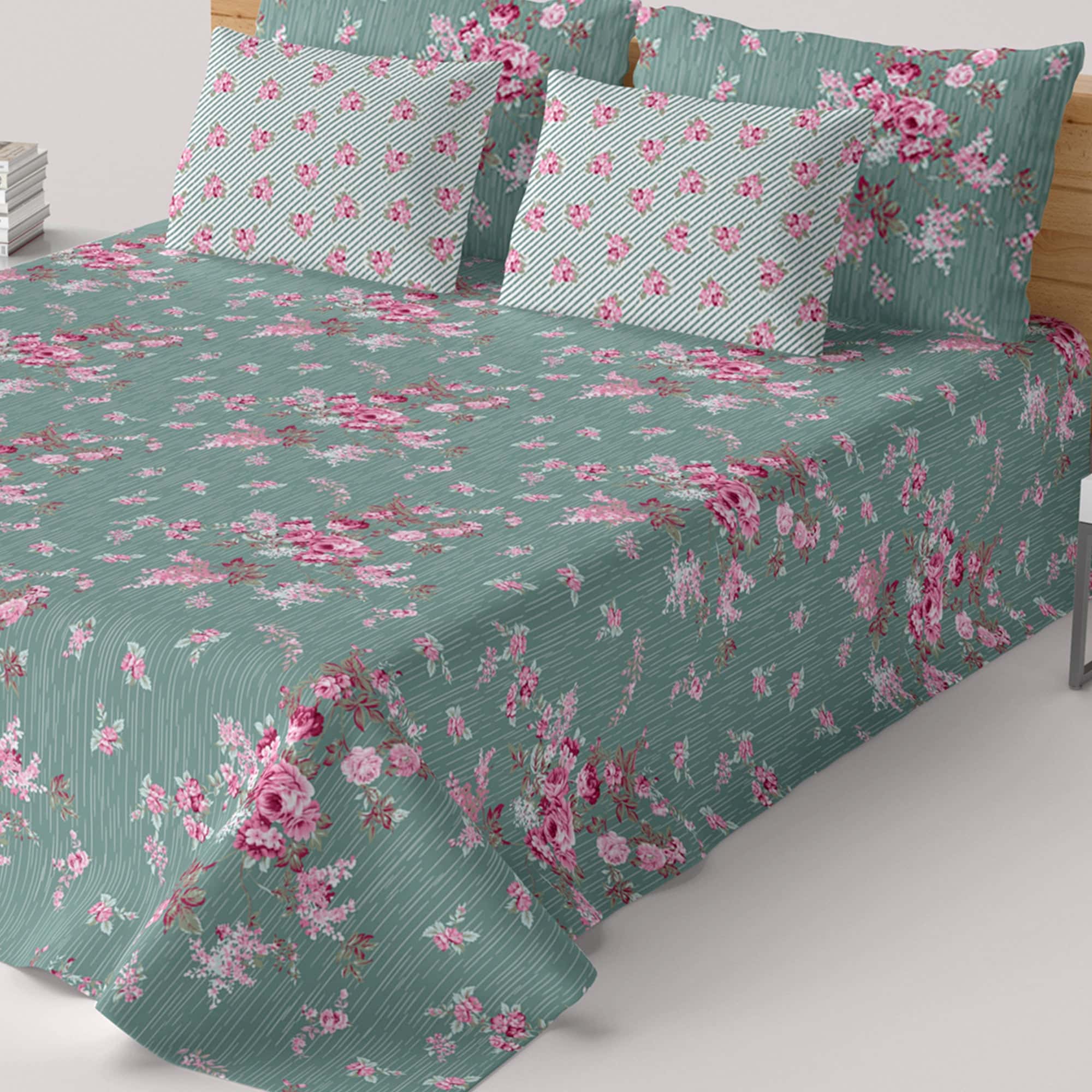 Xara Green Floral Bed Sheet Set with Striped Border - 8448-49