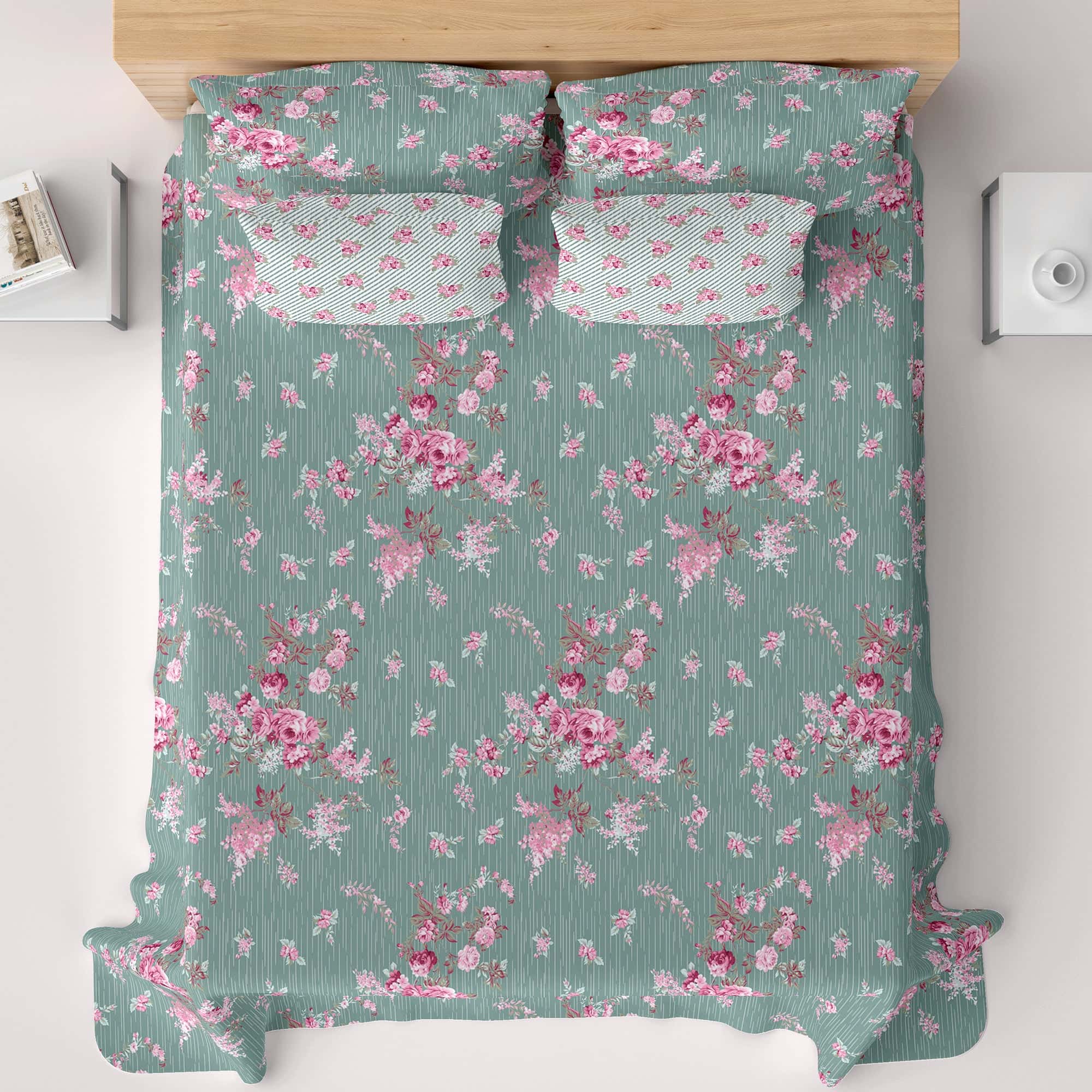 Elevate your bedroom decor with the Xara Green Floral Bed Sheet Set featuring a charming striped border. Crafted from a premium cotton blended fabric, this set combines comfort and durability for a restful night's sleep. The vibrant floral design adds a touch of nature-inspired elegance, while the stylish stripes bring a modern twist. Experience unmatched softness and breathability with this exquisite bed sheet set that transforms your space into a serene retreat. Perfect for any season.