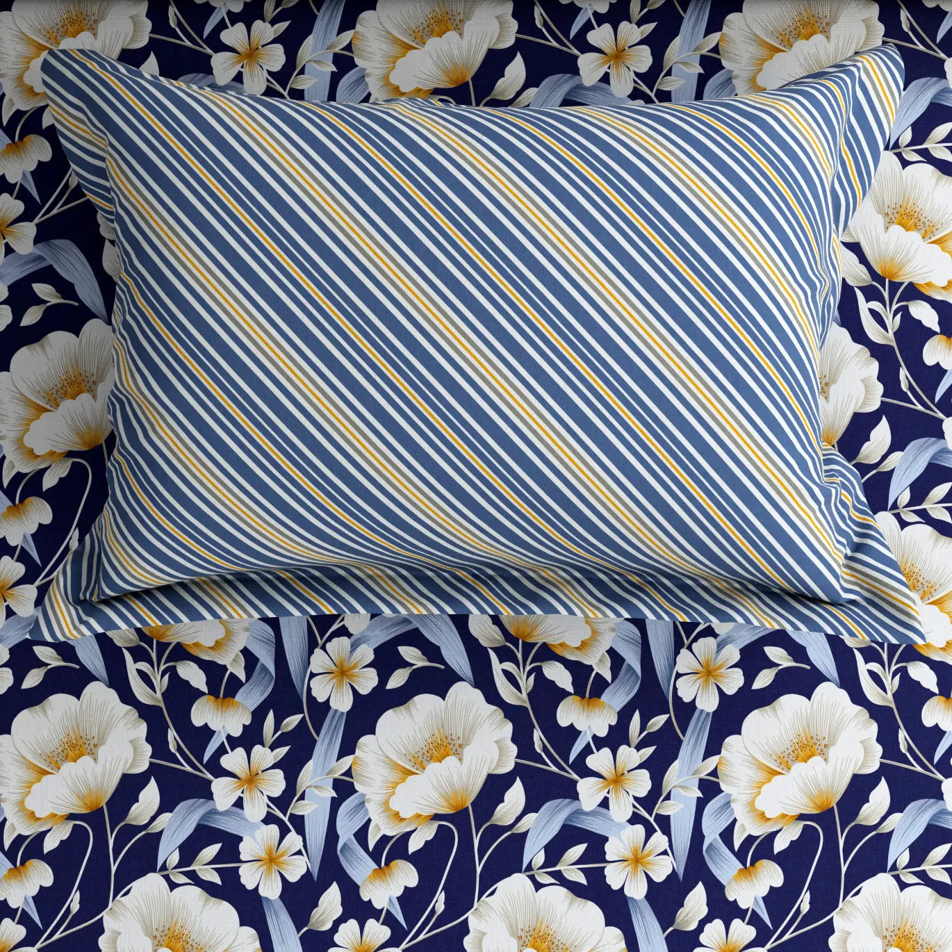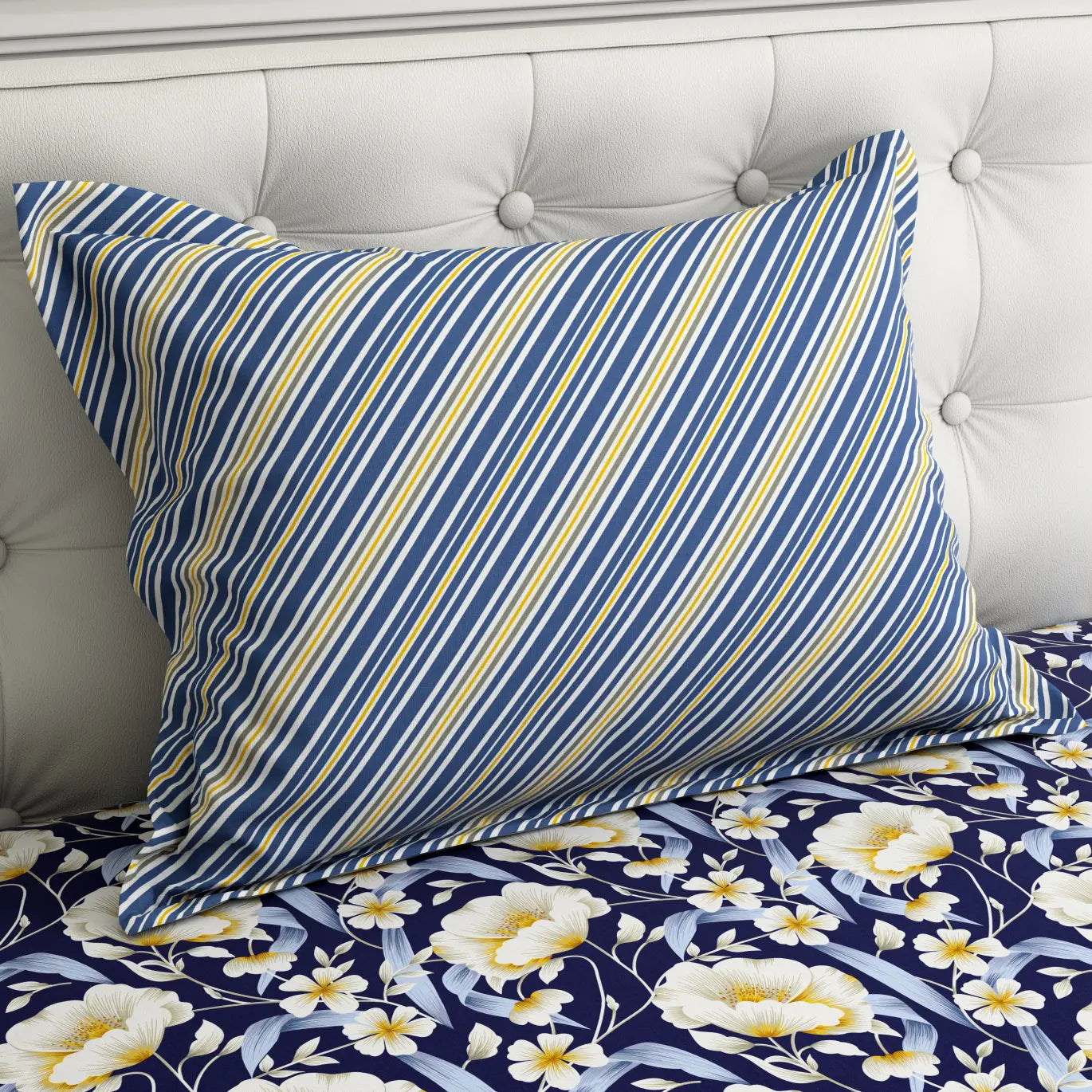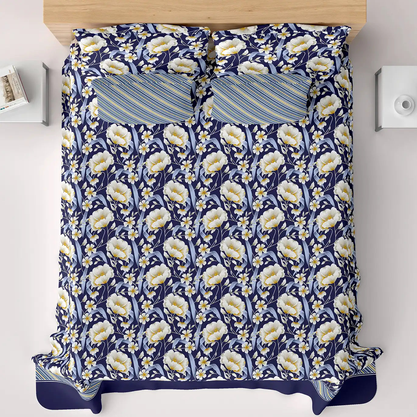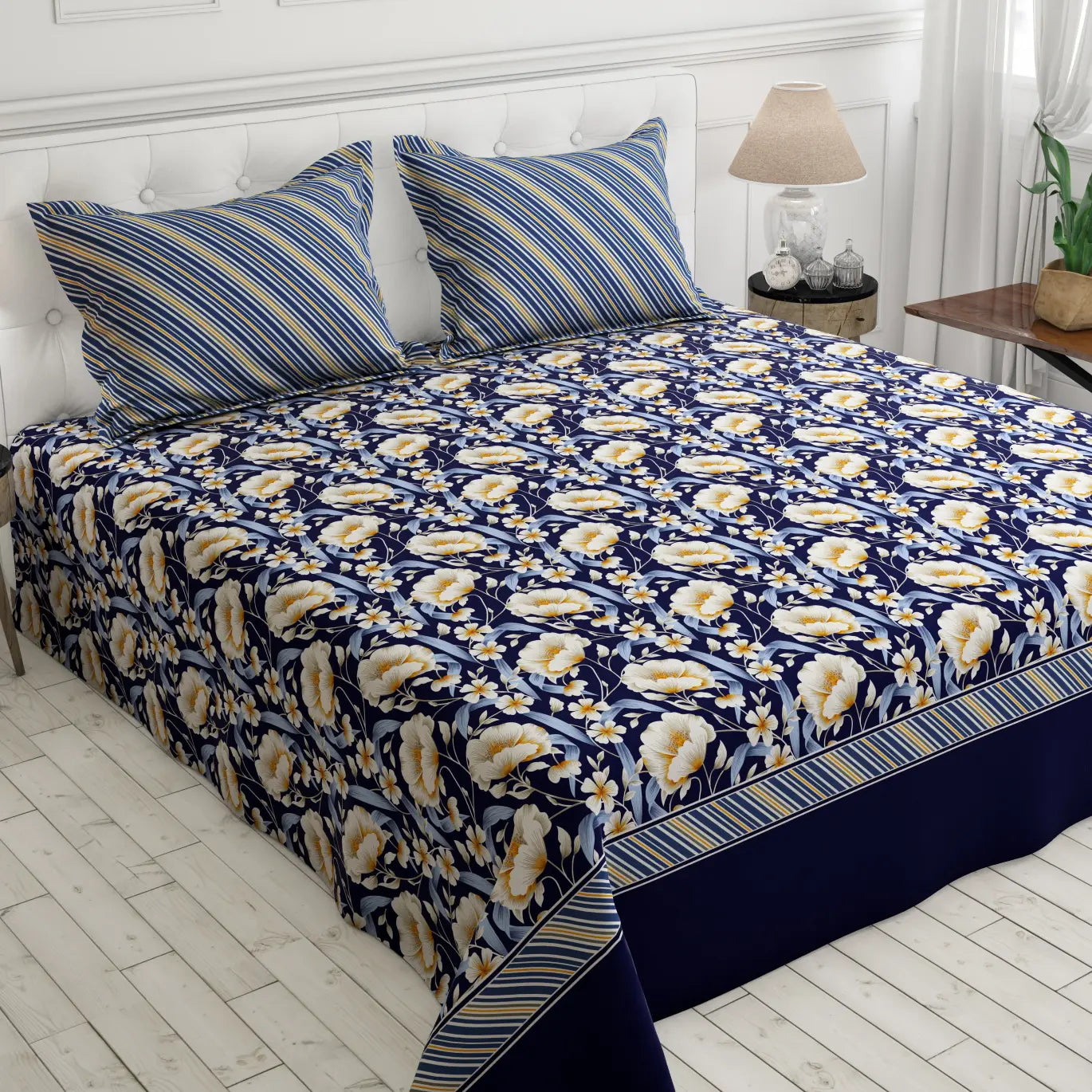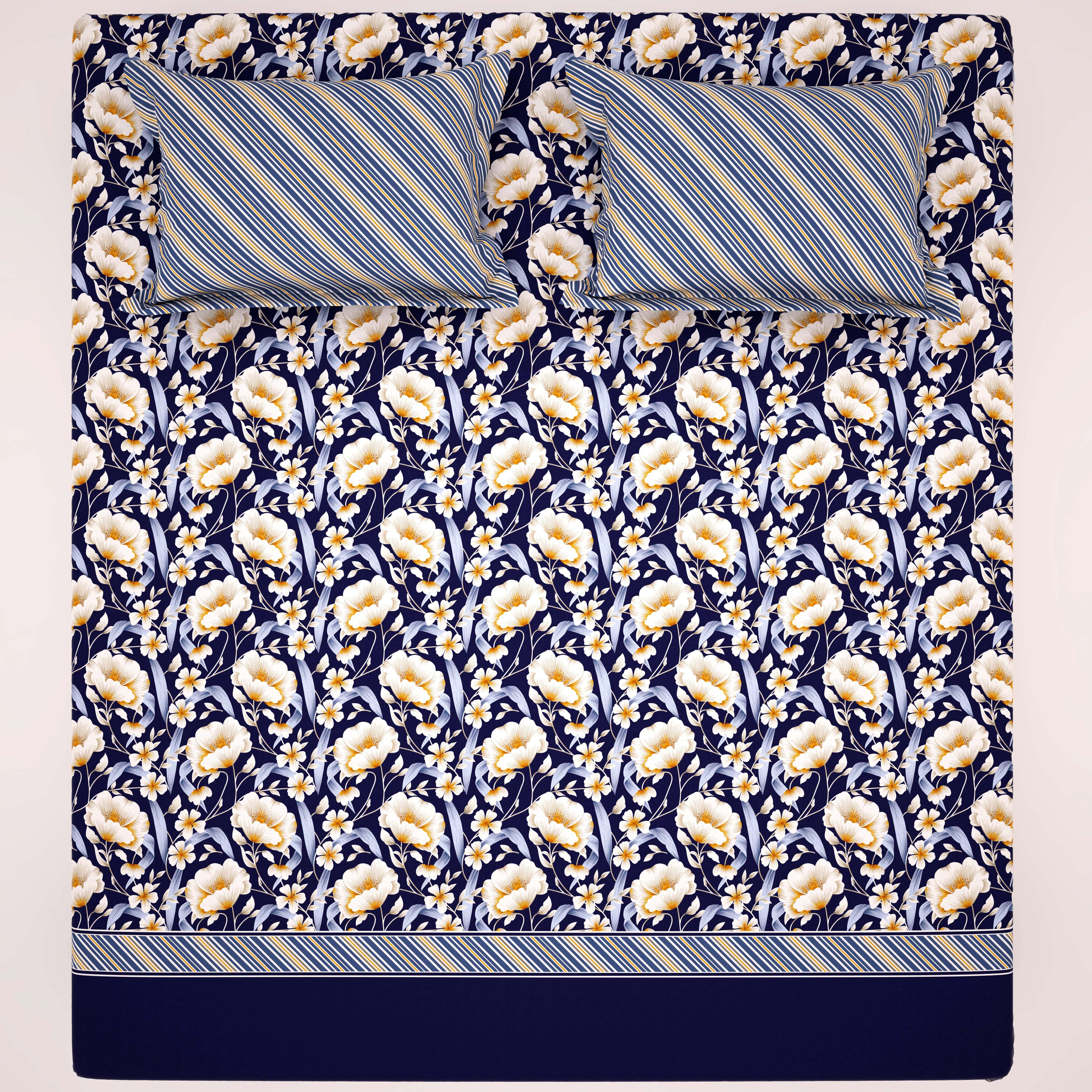 Xara Dark Blue Floral Stripe Border Bed Sheet Set - 8505-06