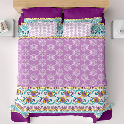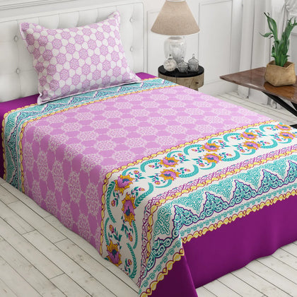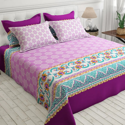 Elevate your bedroom decor with the Xara Purple Floral Striped Border Bed Sheet Set. Crafted from premium poly cotton fabric, this luxurious set features an eye-catching purple floral design accented by elegant striped borders. Experience unparalleled softness and durability while adding a touch of sophistication to your space. Perfect for enhancing any bedding ensemble, the Xara set promises comfort and style for a restful night's sleep. Transform your bedroom into a serene retreat today.