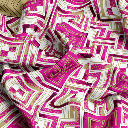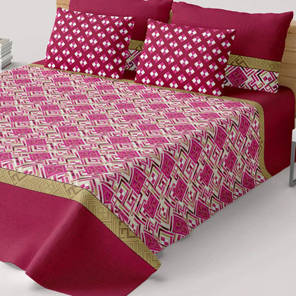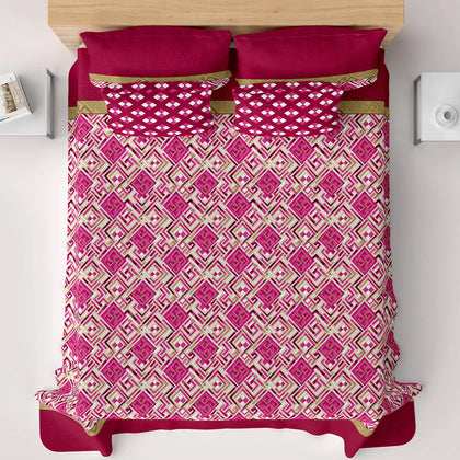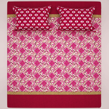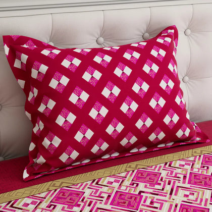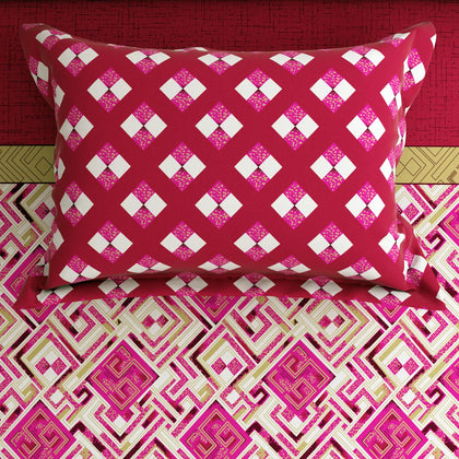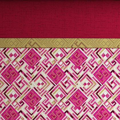 Transform your bedroom with the Xara Maroon Geometric Grid Bed Sheet Set. Crafted from soft, durable cotton blended fabric, this stylish set features a captivating deep red geometric pattern arranged in a chic grid, complemented by elegant striped borders. Experience ultimate comfort and sophistication as you wrap yourself in this exquisite design. Perfect for elevating your decor, the Xara Bed Sheet Set ensures a restful sleep while adding a touch of modern elegance to your space.
