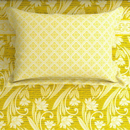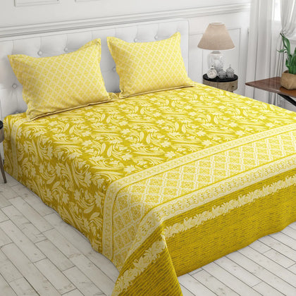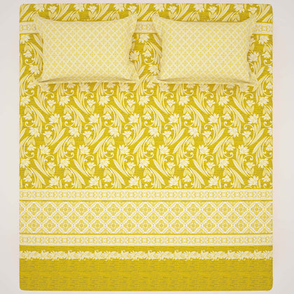 Elevate your bedroom decor with the Xara Yellow Floral Striped Bed Sheet Set. Crafted from premium poly-cotton fabric, this vibrant set features an enchanting floral pattern complemented by elegant stripes on the border. Soft, durable, and breathable, it ensures a cozy night's sleep while adding a touch of cheerful charm to your space. Perfect for any season, this bed sheet set is a must-have for creating a fresh and inviting atmosphere. Transform your bedroom today!