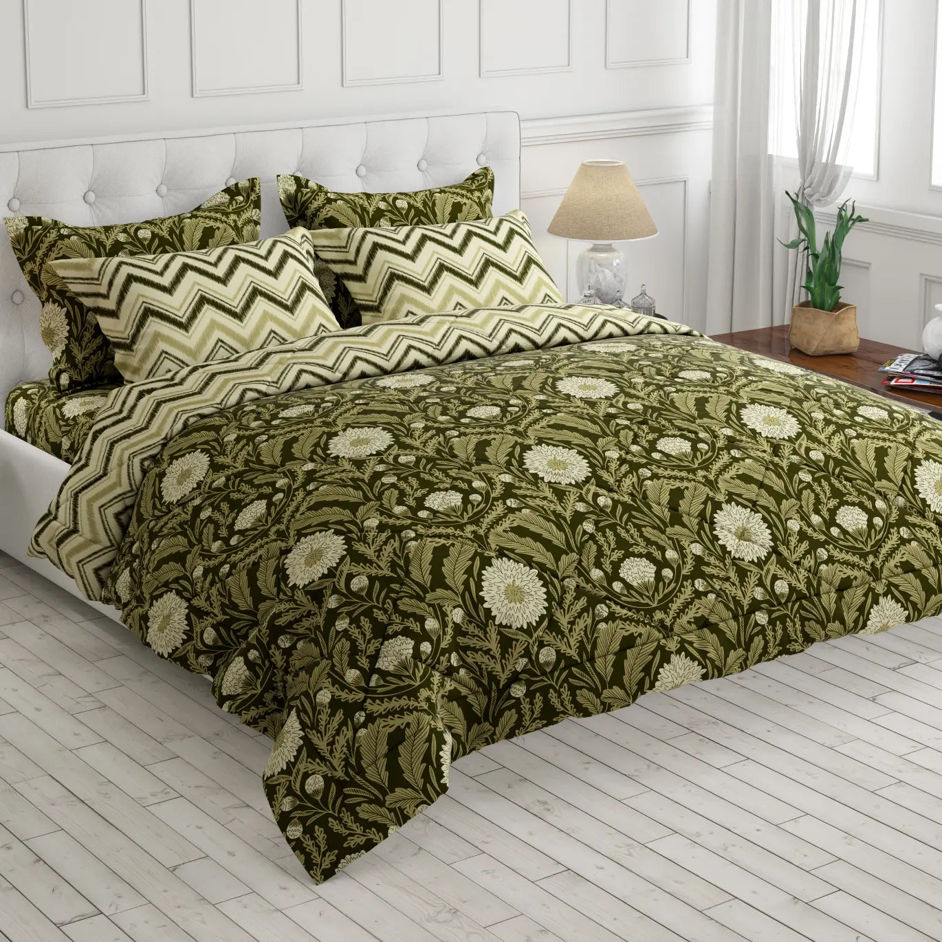 This design features a rich olive green and khaki palette with a large-scale botanical print on one side and a repeating zigzag pattern on the reverse. Made from a comfortable cotton blended fabric, this set offers a stylish and cozy update for your bedroom.