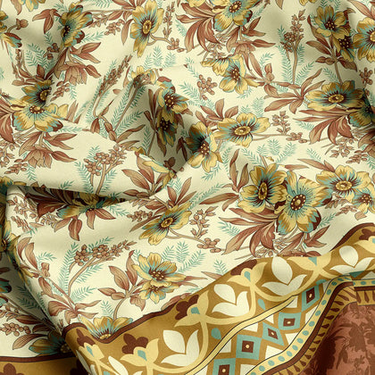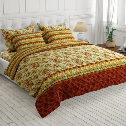 The design is inspired by rich, earthy tones and traditional tapestry motifs. The main area features a beautiful floral pattern framed by a striking geometric striped border in shades of saffron yellow and olive green. The foot of the comforter (and likely the reverse side) features a deep, solid terracotta red color for a bold contrast.