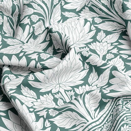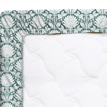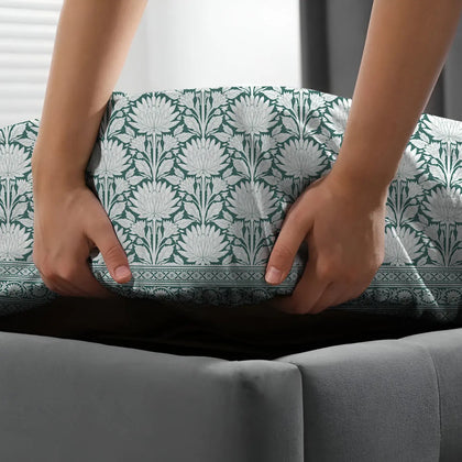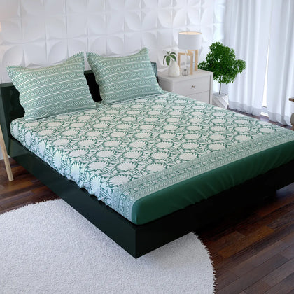 Upgrade your bedroom with our Green in White Cotton Blended Fitted Bed Sheet Set made from luxurious Xara fabric. This soft and breathable set combines comfort and style, providing a cozy sleep experience while adding a fresh touch to your decor. The fitted design ensures a snug fit on your mattress, preventing slipping or bunching. Experience the perfect blend of durability and elegance that will make your bed an inviting retreat.