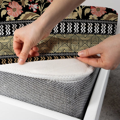 Infuse your bedroom with the dramatic elegance of the Xara Fitted Bed Sheet Set in Floral Brocade. This design features a lush, dynamic pattern of large, stylized red and gold flowers set against a bold black backdrop, creating the rich, textured look of a classic brocade fabric. The design is beautifully finished with a wide, intricate striped border in complementing earthy tones.Crafted from a soft and easy-to-care-for cotton blended fabric, this bedding provides luxurious comfort and breathability for a truly restorative sleep experience. The fitted sheet is designed for a snug, wrinkle-free fit on your mattress, maintaining a sharp, tailored appearance. Complete the regal aesthetic with the coordinating striped pillow covers and turn your room into a sophisticated, striking retreat.