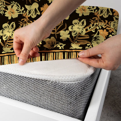 This bedsheet is a Fitted Sheet Set, distinguished by its four-sided elastic construction, which is designed for a secure and snug fit over the mattress. The elastic runs along the entire perimeter of the sheet.The center of the bedsheet is dominated by a dense, all-over pattern of large, repeating floral and foliage motifs. These flowers and leaves are rendered in the golden yellow and brown tones against the solid black background, creating an opulent, dramatic feel.