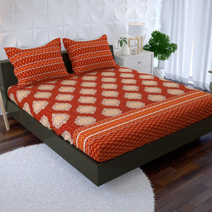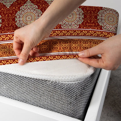 Experience the perfect blend of style with our Terracotta Medallion Fitted Sheet.This sheet features a striking, global-inspired medallion pattern (Jaal) in a warm, sophisticated terracotta orange hue, complemented by lighter neutral accents..Crafted from a soft and durable Cotton Blended fabric, this sheet provides the best of both worlds the natural breathability and comfort of cotton,It's a fitted sheet with elastic all around the edges (on all four sides). This means it holds onto your mattress very tightly.