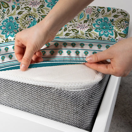 Bring the serene beauty of the ocean floor and a gentle garden into your bedroom with the Xara Fitted Bed Sheet Set in Sea Flora. This design features an enchanting pattern of stylized aqua, teal, and soft green flora reminiscent of submerged botanicals, set against a calming white backdrop. The elegant border and the solid bed base in a rich, deep teal anchor the look, adding depth and sophistication.Made from a soft, durable cotton blended fabric, this bedding provides comfortable, breathable rest and is simple to maintain. The fitted sheet ensures a smooth, secure, and wrinkle-free fit on your mattress. The coordinating pillow covers feature a contrasting white heart motif on a green background, completing this refreshing and nature-inspired aesthetic. Create a peaceful, resort-like atmosphere with this unique and calming set.