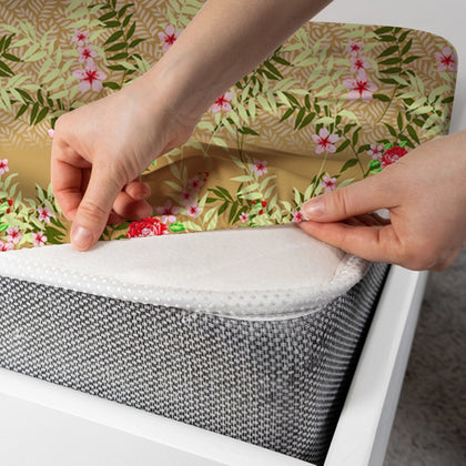 Bring the charming beauty of a country garden into your home with the Xara Fitted Bed Sheet Set. This design features a warm, mustard yellow backdrop beautifully contrasted with a lush, painterly floral border of green foliage, pink, and burgundy blossoms. The style evokes a rustic, nature-inspired feel, perfect for creating a cozy, inviting bedroom sanctuary.Made from a soft, breathable cotton blended fabric, this set offers the ideal combination of comfort, durability, and easy maintenance. The fitted sheet design ensures a smooth, wrinkle-free fit on your mattress every night. Coordinating striped pillow covers finish the look, adding a cheerful, balanced touch. Refresh your décor with this delightful floral set that captures the essence of a tranquil, sunny meadow.