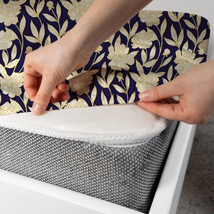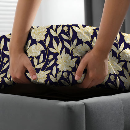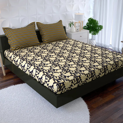 Introduce chic sophistication with the Royal Dusk Fitted Bedsheet Set. This sheet features a high-contrast pattern dominated by a deep blue base, serving as a dramatic canvas for the stylized botanical/floral pattern rendered in a rich, light tan or warm gold tone. This two-tone print is striking and elegant. The set includes matching pillowcases featuring bold, clean horizontal stripes in the same high-contrast colors, adding a structured, modern element. Crafted for a perfect, snug fit on your mattress, this durable sheet provides a comfortable, stylish foundation that is both easy to coordinate and immediately luxurious.