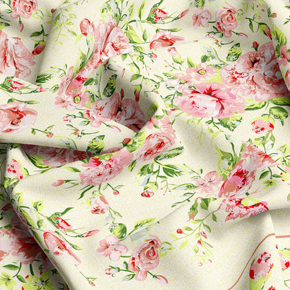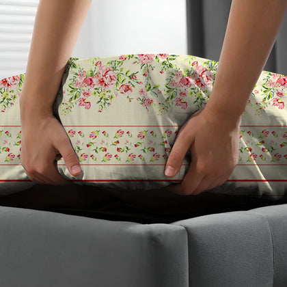 Escape to Petals Haven with this beautifully romantic Xara Fitted Bed Sheet Set. The soft, creamy base color is adorned with delicate bands of pastel pink and yellow floral clusters, creating a serene and utterly charming look. This design evokes the feeling of sleeping in a tranquil, blooming garden, adding a light, airy elegance to your bedroom decor.Crafted from a comfortable and breathable cotton blended fabric, this set ensures a smooth, gentle feel against your skin for a truly restful night's sleep. The fitted sheet provides an easy, snug fit that resists slipping and wrinkling. With its coordinated pillow covers, this set is the perfect choice for creating a peaceful, feminine sanctuary built on comfort and grace.