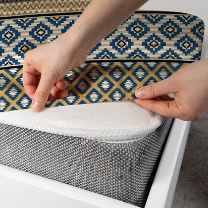 Brighten your bedroom with the cheerful style of the Xara Fitted Bed Sheet Set in Yellow Leaf Geometric Pattern. The center of the sheet features a vibrant mix of yellow and aqua-blue foliage against a light yellow background, creating a fresh, sunlit look. This organic motif is beautifully contrasted by a bold, geometric border of horizontal stripes and structured medallions in rich mustard and cool blue tones.Crafted from a soft and breathable cotton blended fabric, this set offers superior comfort and easy care, ensuring a luxurious and fuss-free addition to your linen closet. The fitted design ensures a snug, wrinkle-free fit that stays perfectly in place on your mattress. Finished with coordinating striped pillow covers, this set seamlessly blends natural inspiration with modern, defined structure.