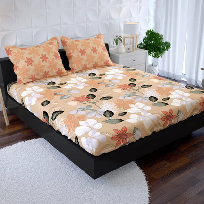 Brighten your bedroom with the cheerful style of the Xara Fitted Bed Sheet Set in Yellow Leaf Geometric Pattern. The center of the sheet features a vibrant mix of yellow and aqua-blue foliage against a light yellow background, creating a fresh, sunlit look. This organic motif is beautifully contrasted by a bold, geometric border of horizontal stripes and structured medallions in rich mustard and cool blue tones.Crafted from a soft and breathable cotton blended fabric, this set offers superior comfort and easy care, ensuring a luxurious and fuss-free addition to your linen closet. The fitted design ensures a snug, wrinkle-free fit that stays perfectly in place on your mattress. Finished with coordinating striped pillow covers, this set seamlessly blends natural inspiration with modern, defined structure.